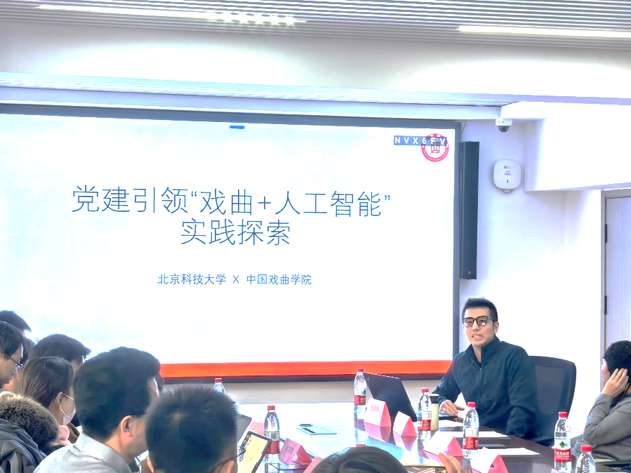 活动在北京科技大学学生活动中心二层大会议室举行。中国戏曲学院舞台美术系党总支书记迟雪峰教授对北京科技大学的精心组织与热情接待表示感谢,并围绕党建工作引领“戏曲+AI”融合创新及戏曲艺术在数字化时代面临的机遇与挑战作主题发言。