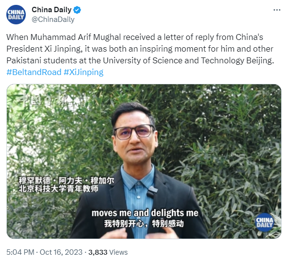 中国日报:当穆罕默德 · 阿里夫 · 莫卧儿收到中国国家主席习近平的回信时,这对于他和北京科技大学的其他巴基斯坦学生来说,都是一个鼓舞人心的时刻。 原视频来...